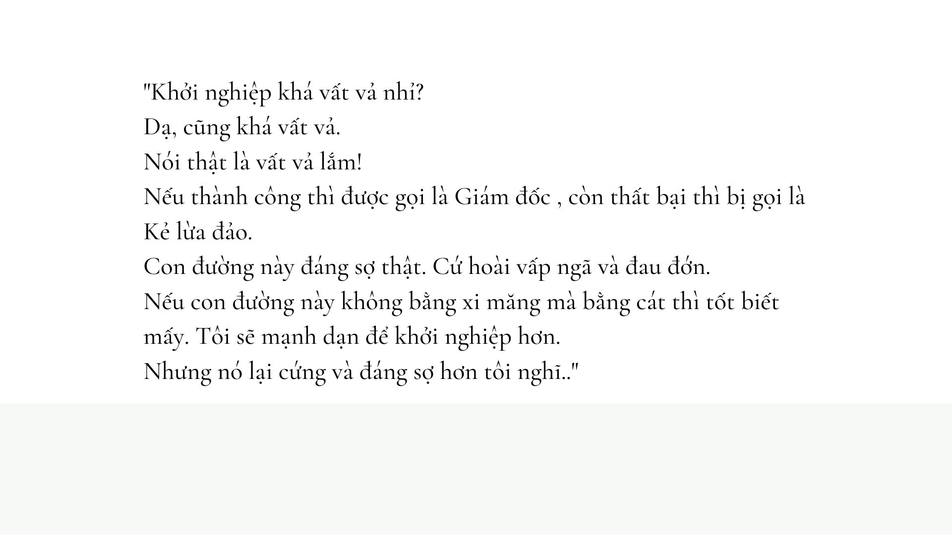 “Khởi nghiệp khá vất vả nhỉ? Dạ, cũng khá vất vả….. Nói thật là vất vả lắm. Nếu thành công thì được gọi là Giám đốc. Còn thất bại thì bị gọi là Kẻ lừa đảo. Con đường này đáng sợ thật. Cứ hoài vấp ngã và đau đớn. Nếu con đường này không bằng xi măng mà bằng cát thì tốt biết mấy. Tôi sẽ mạnh dạn để khởi nghiệp hơn. Nhưng nó lại cứng và đáng sợ hơn tôi nghĩ...”
