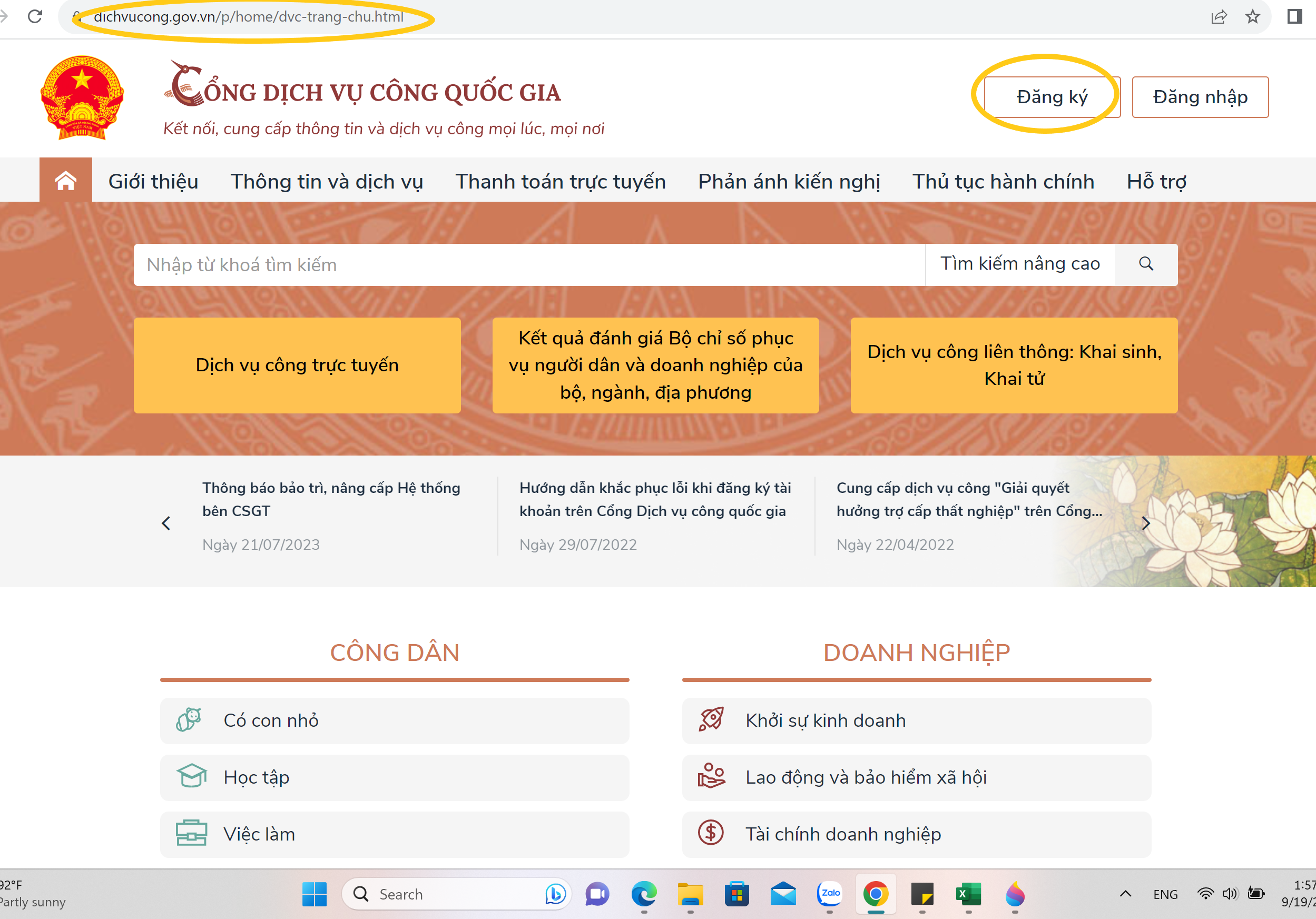 - Vào trang web Dichvucong.gov.vn, nhấn vào mục Đăng ký.