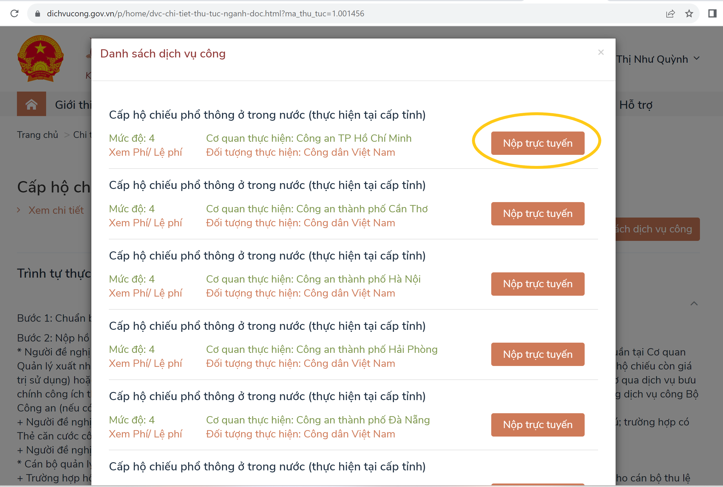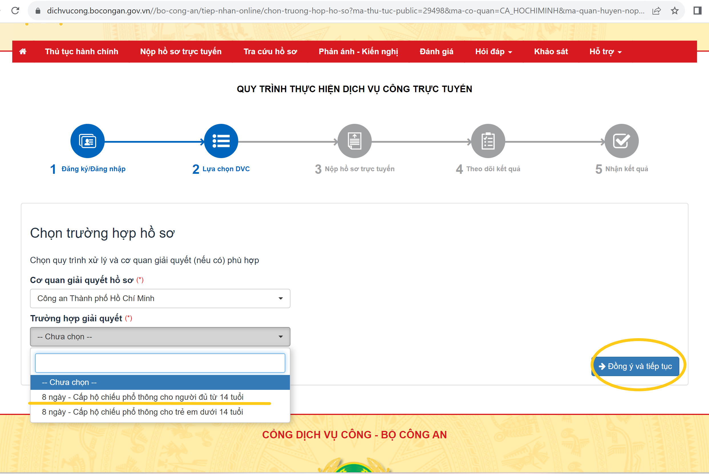 Vào mục Cấp hộ chiếu phổ thông trong nước, Nhấn vào nút Dịch vụ công trực tuyến để chọn Dịch vụ công ở nơi mà mình đăng ký làm Hộ Chiếu. Bạn đang ở khu vực nào thì chọn Cơ quan thực hiện ở nơi đó. Ví dụ: Q ở HCM sẽ chọn Cơ quan thực hiện là Công an TP. Hồ Chí Minh. Nhấn vào nút Nộp trực tuyến, hệ thống sẽ đưa bạn đến trang chọn Trường hợp hồ sơ, bạn chọn mục “8 ngày – Cấp hộ chiếu phổ thông cho người đủ 14 tuổi”. Nhấn vào nút Đồng ý và Tiếp tục, trang web sẽ đưa bạn đến bảng điền thông tin cá nhân.