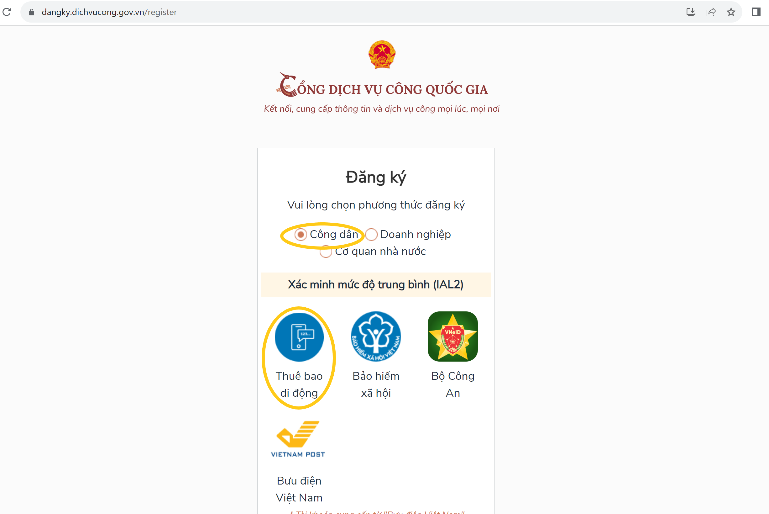 - Ở cửa sổ Đăng ký tài khoản của Cổng dịch vụ công quốc gia. Chọn mục Công Dân và Thuê Bao Di Dộng, ấn Đăng ký.