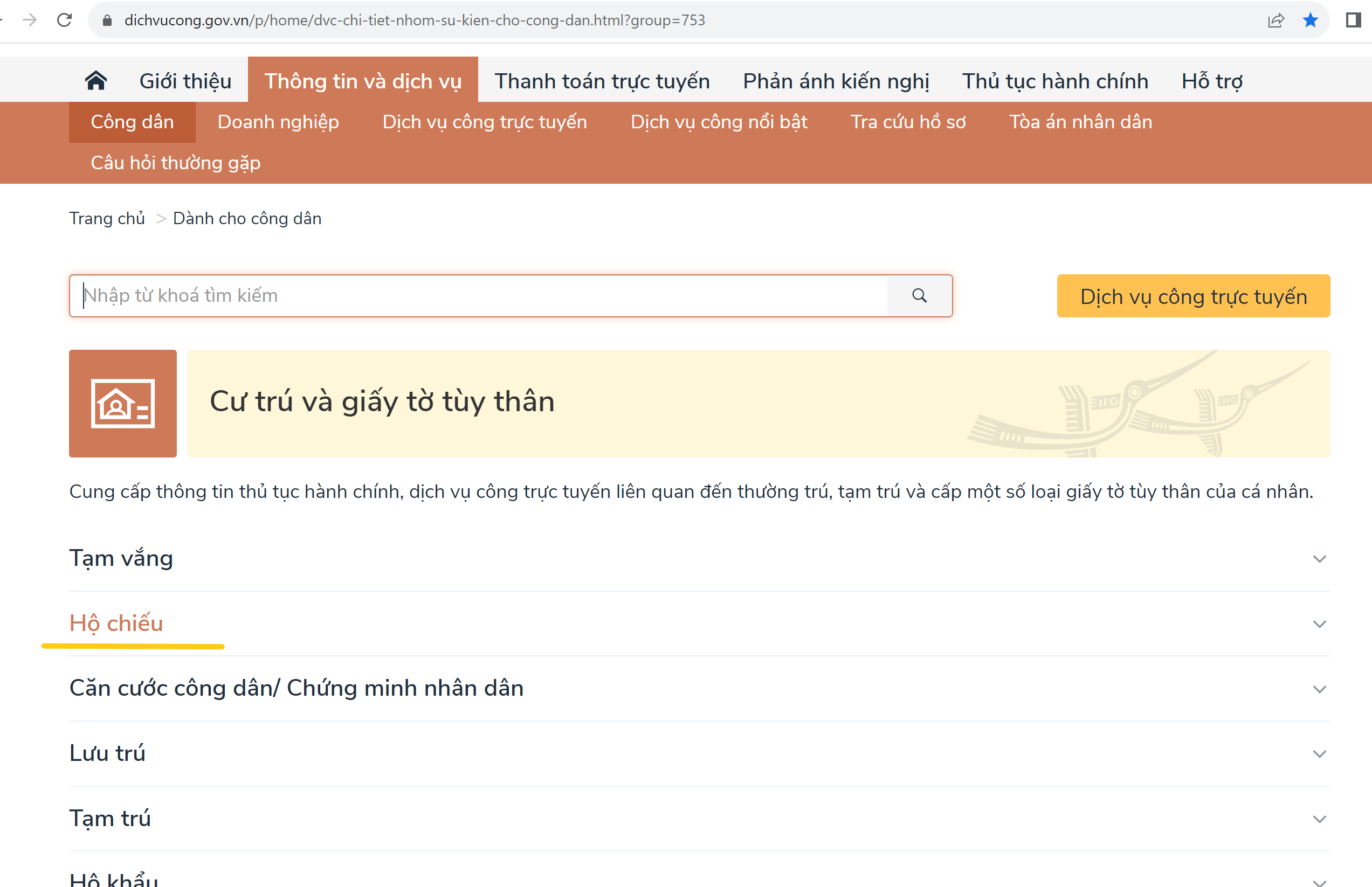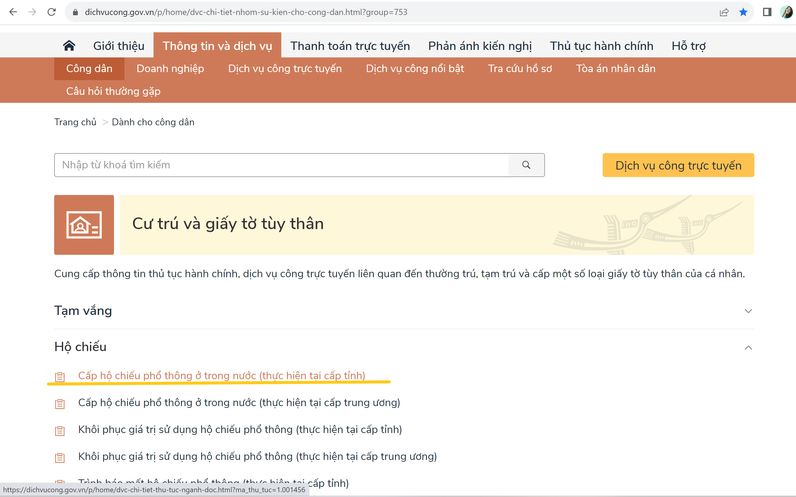 Sau khi đăng nhập được vào tài khoản, chọn mục Cư trú và Giấy tờ tùy thân —> chọn tiếp mục Hộ Chiếu —> chọn mục Cấp hộ chiếu phổ thông ở trong nước (thực hiện tại cấp tỉnh).